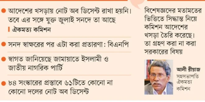 যেসব সংস্কারের বিষয়ে রাজনৈতিক দলগুলো নোট অব ডিসেন্ট (ভিন্নমত) দিয়েছিল, সেগুলোসহ প্রধান উপদেষ্টার উপস্থিতিতে জুলাই সনদ স্বাক্ষরিত হয়। কিন্তু পরে সনদ বাস্তবায়নের আদেশের খসড়ায় ঐকমত্য কমিশন নোট অব ডিসেন্ট (ভিন্নমত) রাখেনি। সনদে স্বাক্ষরকারী বিএনপি একে ‘প্রতারণা’ বলে উল্লেখ করেছে। তারা জাতীয় ঐকমত্য কমিশনের নিরপেক্ষতা নিয়েও প্রশ্ন তুলেছে।