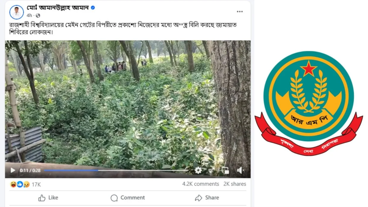 রাজশাহী বিশ্ববিদ্যালয় ছাত্র সংসদ (রাকসু) নির্বাচনের দিন সামাজিক যোগাযোগ মাধ্যমে ভাইরাল হওয়া এক ভিডিও নিয়ে বিভ্রান্তি সৃষ্টি হয়েছে বলে জানিয়েছে রাজশাহী মেট্রোপলিটন পুলিশ (আরএমপি)। পুলিশের দাবি, ওই ভিডিওটি বাস্তবে খাবার খাওয়ার দৃশ্য, কিন্তু সেটিকে বিকৃতভাবে ‘অস্ত্র বিতরণের’ ভিডিও হিসেবে প্রচার করা হয়েছে। পুলিশের বক্তব্য বৃহস্পতিবার (১৬ অক্টোবর) দুপুরে আরএমপি এক সংবাদ বিজ্ঞপ্তিতে জানায়, বিশ্ববিদ্যালয়ের পাশের একটি বাগানে কিছু লোকের আড্ডা …